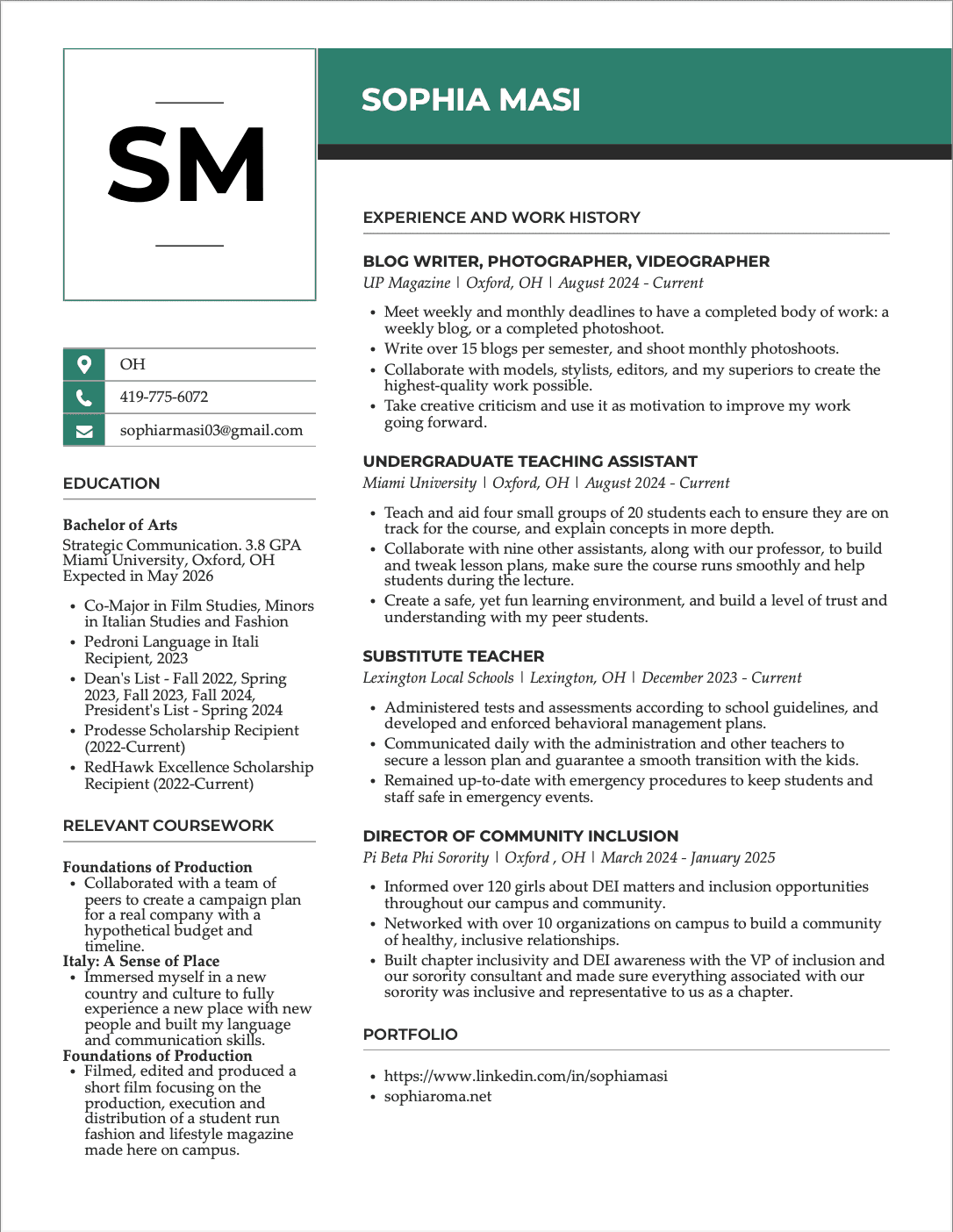 Miami University Media, Journalism, Film Department (2024-Current) | Undergraduate Teaching Assistant |