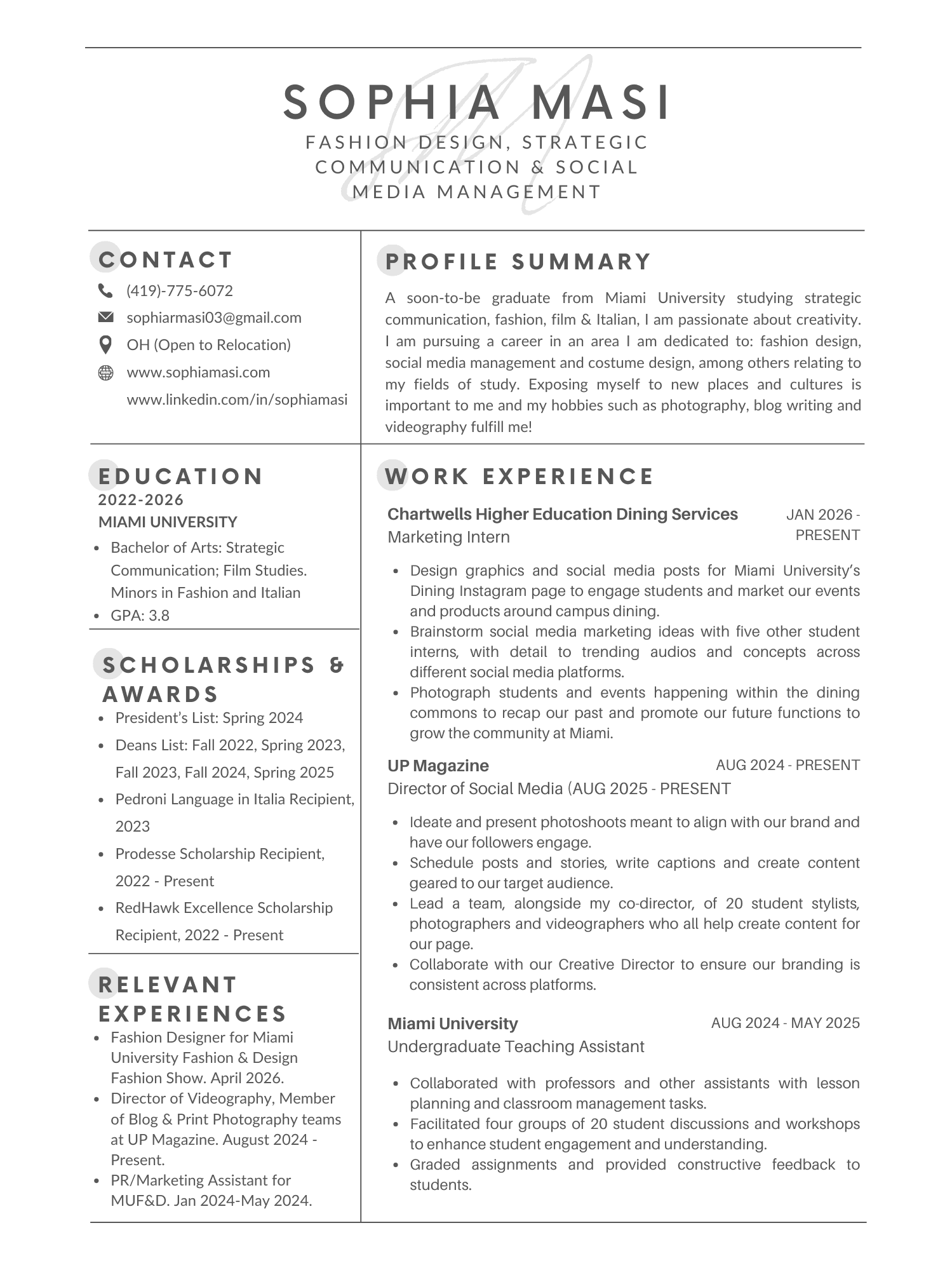 Miami University Fashion & Design (2023-2024) | PR & Marketing Content Creation Assistant |